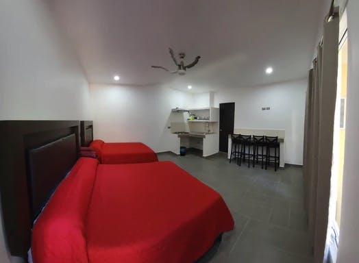 Habitación con dos camas Queen cocineta completa y baño completo a 100 metros del área de las albercas